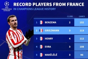 法國球員歐冠出場榜: