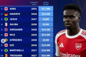 體育資訊2月20日訊 薩卡正式與阿森納完成續(xù)約,德轉也盤點了阿森納隊內年薪榜,其中薩卡位居第一,具體如下(合同期限,年薪):