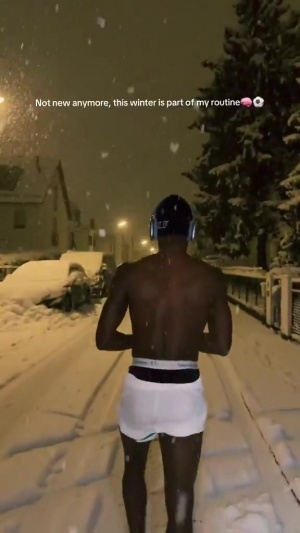 視頻中杰克遜全身赤裸,只穿著一條短褲,他還配文:冬天已經不再新鮮了,它現在是我日常的一部分。