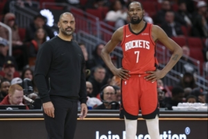 火箭球迷:范弗里特?問題比那嚴(yán)重多了。想象一下,在整整一節(jié)的時間里,除了杜蘭特單打之外,根本組織不起任何其他的進(jìn)攻戰(zhàn)術(shù)。烏度卡在進(jìn)攻端簡直一竅不通。