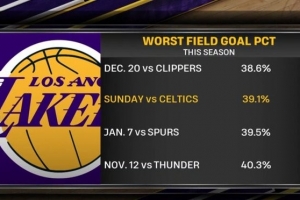 湖人今天慘敗凱爾特人,全隊命中率僅39.1%,賽季倒數第二低。