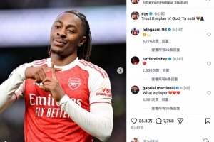 體育資訊2月23日訊 英超第27輪,阿森納客場4比1大勝熱刺,笑傲北倫敦德比。賽后,梅開二度的埃澤更新社媒慶祝勝利。