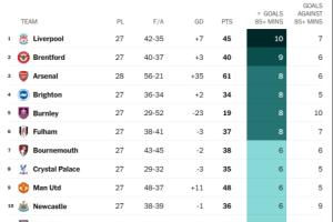 體育資訊02月26日訊 TA統(tǒng)計了本賽季英超球隊85分鐘及以后的進(jìn)球及丟球排行榜,其中利物浦以10球位列榜首,阿森納8球位列第三。