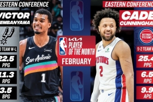 體育資訊3月4日訊 今日NBA官方宣布,馬刺球星文班亞馬和活塞球星坎寧安分別被評為西部和東部二月份最佳球員。