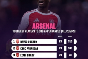 以下為阿森納隊(duì)史達(dá)成300場里程碑最年輕球員top5: