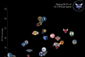 橫軸-三分總出手數(shù);縱軸-三分命中率;黃蜂場均出手43.7次&命中率為39.3%