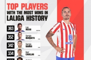 體育資訊3月8日訊 西甲統(tǒng)計了球員在該聯(lián)賽的取勝場次,并列出西甲歷史勝場排名,梅西383勝居首,格列茲曼310勝躋身前十。