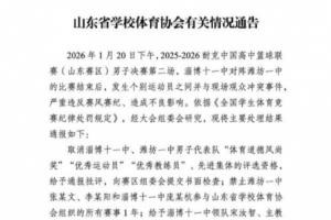 山東省學(xué)校體育協(xié)會公布的情況通告稱,取消淄博十一中、濰坊一中男子代表隊“體育道德風(fēng)尚獎”“優(yōu)秀運動員”“優(yōu)秀教練員”、先進集體的評選資格,給予通報批評,向賽區(qū)組委會提交書面檢查;禁止濰坊一中張某文、李某陽和淄博十一中龐某杭參與山東省學(xué)校體育協(xié)會組織的所有賽事1年;給予淄博十一中領(lǐng)隊宋汝智、主教練張鋒、助理教練王文奎和濰坊一中領(lǐng)隊劉勝利、主教練程潔、助理教練張建新賽區(qū)通報批評;取消淄博十一中承辦山東省學(xué)校體育協(xié)會相關(guān)比賽3年。