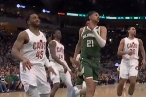 GIF-雄鹿不敵騎士,比賽中烏斯曼·吉昂在米切爾面前使用后者招牌海底撈大回環(huán),結(jié)果脫手出界,米切爾看笑了!