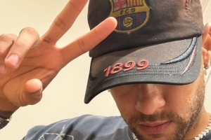 內(nèi)馬爾社媒曬出照片,他的衣服和帽子上都有巴薩隊(duì)徽?qǐng)D案。