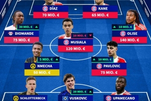 中場:恩梅查(5000萬歐)、帕夫洛維奇(7500萬歐)、揚·迪奧曼德(7500萬歐)、穆西亞拉(1.2億歐)、奧利塞(1.4億歐)