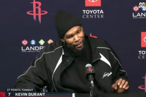 體育資訊3月22日訊 NBA常規(guī)賽,火箭主場(chǎng)123-122險(xiǎn)勝熱火。賽后杜蘭特接受采訪,他透露隊(duì)友們?cè)诟率覞娝疄樗麘c祝得分超越喬丹的里程碑。