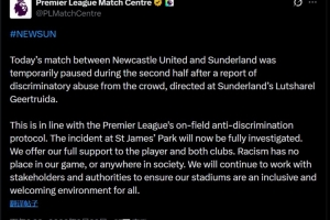 “此舉符合英超聯(lián)賽的場上反歧視協(xié)議。圣詹姆斯公園球場發(fā)生的這起事件現(xiàn)在將接受全面調(diào)查。我們向該球員及兩家俱樂部提供全力支持。種族主義在我們的比賽中、或社會任何角落都絕無立足之地。我們將繼續(xù)與各利益相關方及當局合作,確保我們的球場成為一個對所有人極具包容性且受歡迎的環(huán)境?!?/p>