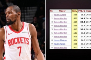 本場(chǎng)比賽過(guò)后,杜蘭特場(chǎng)均26.3分,真實(shí)命中率63.6%,創(chuàng)火箭隊(duì)史場(chǎng)均20+球員中真實(shí)命中率歷史新高。