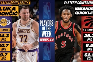 體育資訊1月27日訊 今日NBA官方宣布,湖人球星盧卡·東契奇和猛龍后衛(wèi)奎克利分別當選本賽季第14周西部和東部周最佳球員。